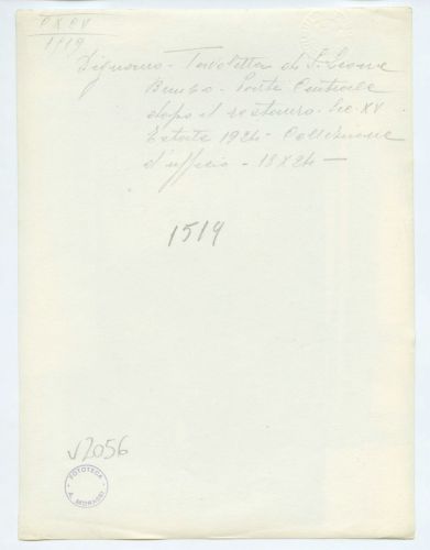 - ISCRIZIONI sul supporto primario: verso: a destra - Dignano - Tavoletta di S. Leone/ Bembo. Parte centrale/ dopo il restauro. Sec. XV/ Estate 1924. Collezione/ d'ufficio - 18x24 - - a matita -