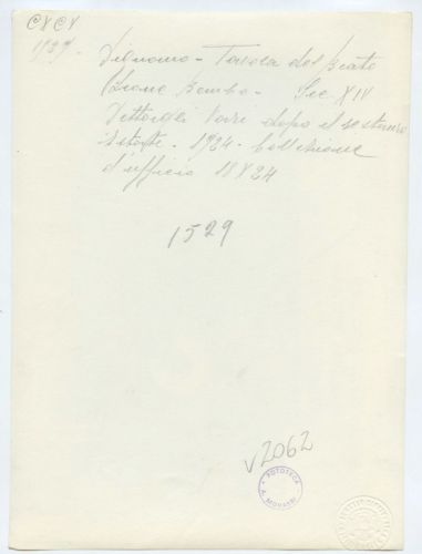 - ISCRIZIONI sul supporto primario: verso: a sinistra - Dignano - Tavola del Beato/ Leone Bembo. Sec. XIV/ Dettagli vari dopo il restauro/ Estate 1924/ Collezione/ d'ufficio 18x24 - a matita -