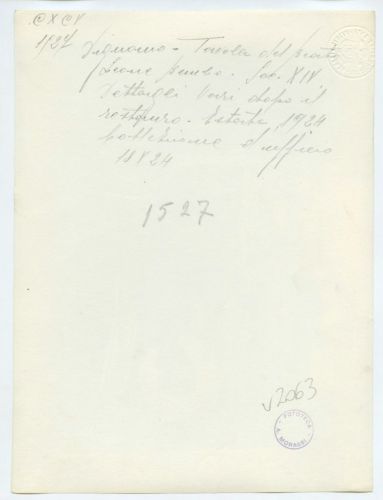 - NOTIZIE STORICO CRITICHE La fotografia fa parte dell'insieme archivistico denominato "Venezia Giulia" (tre cartelle: V. VIII, V. IX, V. X), nello specifico, è conservata all'interno della cartella V. VIII. E' stata realizzata da Pietro Opiglia, che dal 1908 al 1947, svolse il ruolo di fotografo presso il Museo Civico triestino e del quale si serviva l'Ufficio Belle Arti della Venezia Giulia durante le proprie campagne fotografiche. In questo caso, l'Ufficio Belle Arti aveva promosso una campagna ricognitiva circa le opere d'arte presenti sul territorio transfrontaliero che oggi comprende il Friuli Venezia Giulia, la Croazia e la Slovenia. Si ricorda, inoltre, che Antonio Morassi svolse il ruolo di funzionario sovrintendente presso l'Ufficio Belle Arti della Venezia Giulia dal 1920 al 1925.