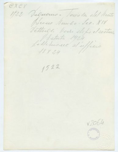 - ISCRIZIONI sul supporto primario: verso: in alto al centro - Dignano - Tavola del Beato/ Leone Bembo. Sec. XIV/ Dettagli vari dopo il restauro/ Estate 1924/ Collezione d'ufficio/ 18x24 - a matita -