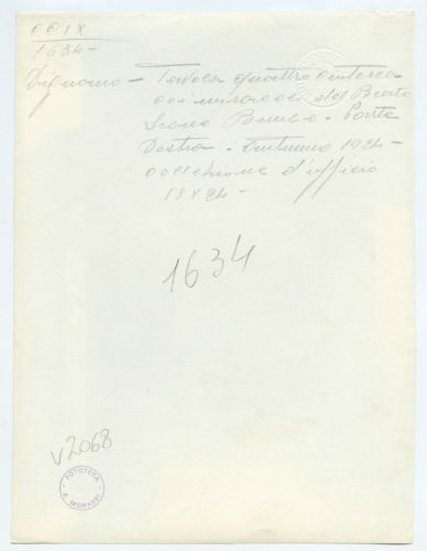 - ISCRIZIONI sul supporto primario: verso: a sinistra - Dignano - Tavoletta quattrocentesca/ coi miracoli del Beato/ Leone Bembo. Parte/ destra. Autunno 1924/ collezione d'ufficio 18x24 - - a matita -
