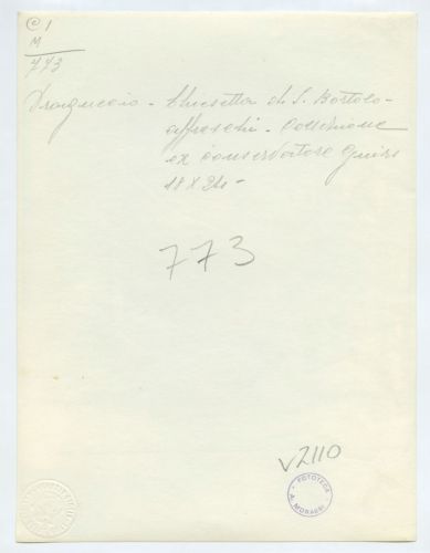 - ISCRIZIONI sul supporto primario: verso: in alto - Dragucchio - Chiesetta di S. Bortolo/ affreschi - Collezione/ ex conservatore Gmirs/ 18x24 - - a matita -