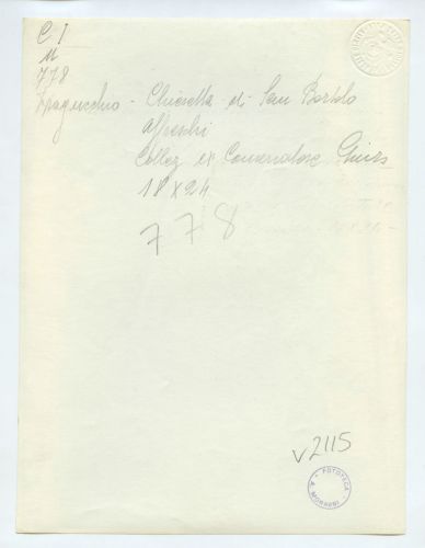 - ISCRIZIONI sul supporto primario: verso: a sinistra - Dragucchio - Chiesetta di San Bortolo/ affreschi/ Collez. ex conservatore Gnirs/ 18x24 - a matita -