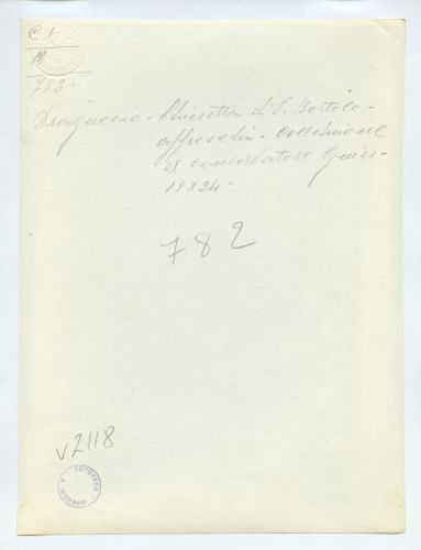 - ISCRIZIONI sul supporto primario: verso: a sinsitra - Draguccio - Chiesetta di San Bortolo/ affreschi Collezione/ ex conservatore Gnirs/ 18x24 - a matita -
