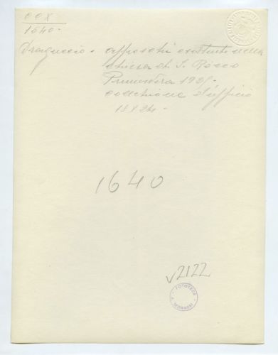 - ISCRIZIONI sul supporto primario: verso: a destra - Draguccio. Affreschi esistenti nella/ chiesa di S. Rocco/ Primavera 1925./ Collezione d'ufficio 18x24 - a matita -
