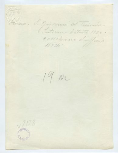 - ISCRIZIONI sul supporto primario: verso: in alto - Duino. S. Giovanni al Timavo/ Interno. Estate 1920 -/ Collezione d'ufficio/18x24 - a matita -