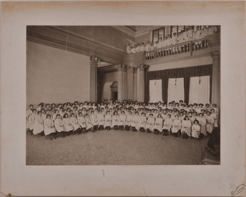 I bordi del supporto secondario sono stati rifilati. L'iscrizione sul verso, al centro, è costituita da una serie di numeri in sequenza disposti in righe curve orizzontali che seguono sommariamente l'andamento delle file delle allieve nell'immagine; alternati ai numeri vi sono alcuni nomi.