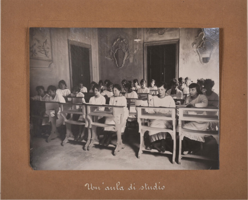 - NOTIZIE STORICO CRITICHE Fotografia proveniente da un album oggi smembrato di consistenza originaria non determinata. In epoca non nota, il supporto secondario è stato ritagliato, la fotografia è stata incorniciata ed esposta alle pareti dell'area d'ingresso dell'edificio scolastico. La derivazione si desume dall'aspetto materiale del supporto secondario e dell'iscrizione al recto, simili agli esemplari integri appartenenti all'insieme.