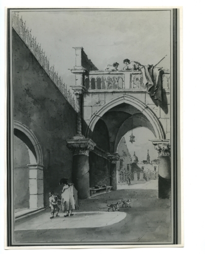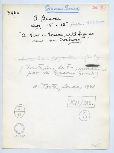 - ISCRIZIONI verso - Giacomo Guardi - 3924 - Dis. 6 - F. Guardi/ dim. 18 x 12/ "A view in Venice, with figures/ near an Archway" - inches. 43 x 30 cm. - (Imitazione da Fr., probabilmente/ fatta da Giacomo Guardi) - A. Tooth, London, 1968 - XVI/DIS. - 6 - I/12 - 19436 - 15.738 - Fototeca-A. Morassi - Mittente. Morassi, Antonio e collaboratori. Collaboratori dell'Archivio Fototeca Antonio Morassi -