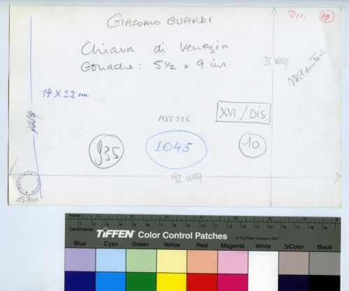 - ISCRIZIONI sul supporto primario: verso - Giacomo Guardi/ Chiara di Venezia/ Gouache 5 1/2 x 9 inc. - 14x22 cm. - Wildenstein - XVI/DIP. - 10 - Dis 10 - 1045 - N55736 - 935 - cm. 3 - 92 mm - 55 mm - 15.740 - Fototeca-A. Morassi - Morassi, Antonio e collaboratori. Collaboratori dell'Archivio Fototeca Antonio Morassi -