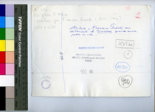 - ISCRIZIONI sul supporto primario: verso - n° 436/ La place St Marc/ peinture par Francesco Guardi (1712-1793)/ 0,26 x 0,35 - attribuiti a Francesco Guardi, ma/ certamente di Giacomo, quando ancora/ padre in vita - 1/ ill - PHOTO HELENE ADANT - MENTION OBLIGATOIRE/ MUSEE NISSIM de CAMONDO/ PARIS - XVI DIP. - 1 - 1030 - 920 - cm. 3 - 100 mm - Fototeca A-Morassi - 15.716 - Mittente. Morassi, Antonio e collaboratori. Collaboratori dell'Archivio Fototeca Antonio Morassi -