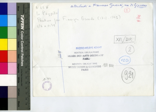 - ISCRIZIONI sul supporto primario: verso - N 436/ La Piazzetta/ Peinture pare Francois Guardi (1712-1793)/ 0,26x0,35 - attribuiti a Francesco Guardi, ma di Giacomo - 2 - ill - XVI/DIP. - 1031 - 921 - cm. 3 - 100 mm - PHOTO HELEN ADANT - MENTION OBLIGATOIRE/ MUSEE DES ARTS DECORATIF/ PARIS/ MENTION OBLIGATOIRE/ MUSEE NISSIM de CAMONDO/ PARIS - Fototeca A.-Morassi - 15.717 - Mittente. Morassi, Antonio e collaboratori. Collaboratori dell'Archivio Fototeca Antonio Morassi -