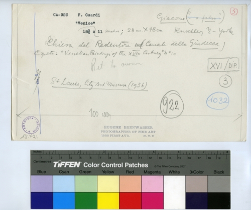 - ISCRIZIONI sul supporto primario: verso - CA-923 F. Guardi/ Venice/ 18 3/4 x 11 - inches; 28 cm x 48 cm/ Giacomo (? o falso?)/ Chiesa del Redentore (Canale della Giudecca)/ Esposto: "Venetian Paintings of the XVIII Century n° 0/ Rit. to owner/ St. Louis, City Art Museum (1936)/ Knoedler, N. York - 3 - 1032 - XVI/DIP./ 3 - 922 - cm. 3 - 100 mm - EUGENE BREWASSER/ PHOTOGRAPHER OF FINE ART/ 1588 FIRST AVR. N.Y.O. - Fototeca-A. Morassi - 15.721 - Mittente. Morassi, Antonio e collaboratori. Collaboratori dell'Archivio Fototeca Antonio Morassi -
