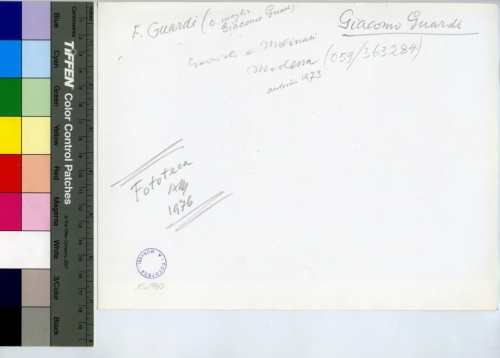 - ISCRIZIONI verso - F. Guardi (o meglio Giacomo Guardi)/ Gavioli e Molinari Modena/ autunno 1973/ 059/363284 - Giacomo Guardi - Fototeca/ AM/ 1976 - Fototeca-A. Morassi - 15.780 - Morassi, Antonio e collaboratori. Collaboratori dell'Archivio Fototeca Antonio Morassi -