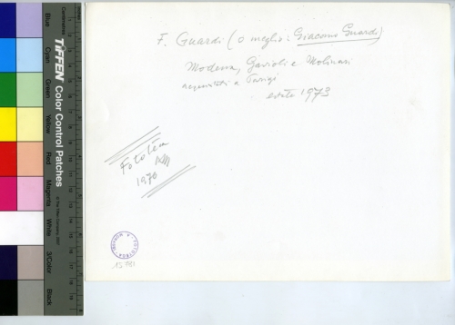 - ISCRIZIONI sul supporto primario: verso - F. Guardi (o meglio Giacomo Guardi)/ Modena, Gavioli e Molinari/ acquistati a a Parigi/ estate 1973 - Fototeca/ AM/ 1976 - Fototeca-A. Morassi - 15781 - Morassi, Antonio e collaboratori. Collaboratori dell'Archivio Fototeca Antonio Morassi -