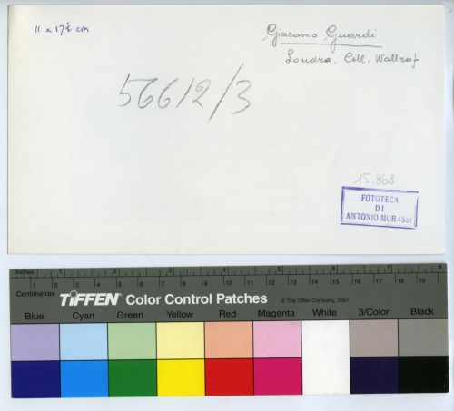- ISCRIZIONI sul supporto primario: verso - 11x12 1/2 cm - Giacomo Guardi/ Londra, Coll. Wallraf - 56612/3 - Fototeca di Antonio Morassi - 15.868 - Morassi, Antonio e collaboratori. Collaboratori dell'Archivio Fototeca Antonio Morassi -