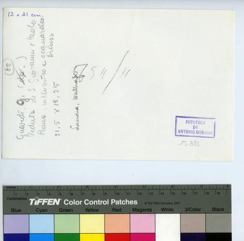 - ISCRIZIONI sul supporto primario: verso - 12x21 cm - 82 - Guardi G./ Veduta di S. Giovanni e Paolo/ Penna, inchiostro e acquerello [...] - 21,5x12,5 - Londra, Wallraf - 56511/11 - Fototeca di Antonio Morassi - 15.883 - Morassi, Antonio e collaboratori. Collaboratori dell'Archivio Fototeca Antonio Morassi -