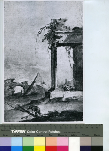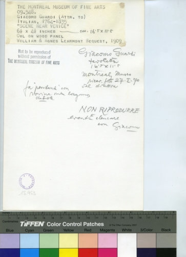 - ISCRIZIONI sul supporto primario: verso - The Montreal Museum of Fine Arts/ 09.548/ Giacomo Guardi (Attr.to)/ Italian, 1764-1835/ "Scene near Venice"/ 6 1/2x4 1/2 Inches/ oil on wood panel/ Willian & Agnes Learmont Bequest, 1909 - Not to be reproduced/ without permission of the Montreal Museum of Fine Arts - Giacomo Guardi/ Tavoletta/ 16,5x11,5/ Montreal Museo/ ricev. foto 27.I.70/ dal direttore/ fa "pendant" con/ rovine nella laguna [...] - Non riprodurre/ [...]/ con Giacomo - Fototeca-A. Morassi - 15.953 - Mittente. Morassi, Antonio e collaboratori. Collaboratori dell'Archivio Fototeca Antonio Morassi -