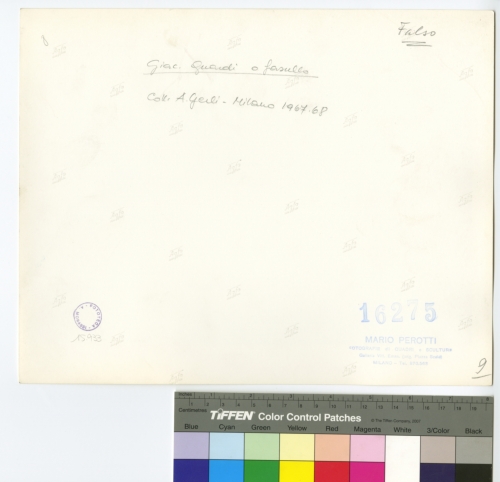 - ISCRIZIONI sul supporto primario: verso - Falso - Giac. Guardi o falsullo - Coll. A. Gerli,Milano 1967-68 - 16275/ Mario Perotti/ fotografie di quadri e sculture/ Galleria Vitt. Eman. (ang. Piazza Scala)/ Milano-Tel 870563 - Fototeca-A. Morassi - 15.933 - Mittente. Morassi, Antonio e collaboratori. Collaboratori dell'Archivio Fototeca Antonio Morassi -