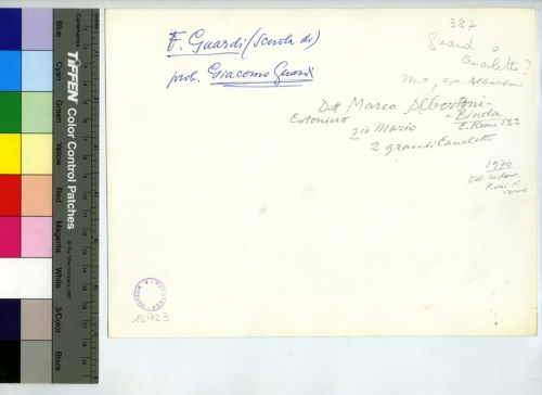 - ISCRIZIONI sul supporto primario: verso - F Guardi (Scuola di)/ prob. Giacomo Guardi - 387/ Guardi o [...]/ [...] Coll. Albertoni - Dott. MArco Albertoni/ Binda/ C. Roma 122 - [...]/ zio Mario/ 2 grandi Canaletto - 1970 [...] - Fototeca-A. Morassi - 15.923 - Morassi, Antonio e collaboratori. Collaboratori dell'Archivio Fototeca Antonio Morassi -