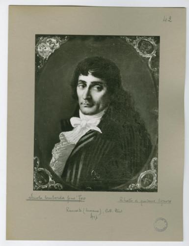 - NOTIZIE STORICO CRITICHE La fotografia, che riproduce il Ritratto di giovane signore di Scuola lombarda della fine del Settecento, fa parte dell'insieme archivistico denominato "Collezione Züst" (due cartelle: C. XI e C. XII), nello specifico, è conservata all'interno della cartella C. XI. Trattasi del frutto dello studio condotto da Antonio Morassi sulla collezione di Giovanni Züst nel 1957. La fotografia è montata su cartoncino. Una fotografia che riproduce un particolare del dipinto (due stemmi in alto a sinistra) di trova nella cartella C. XI (inv. C.1645).