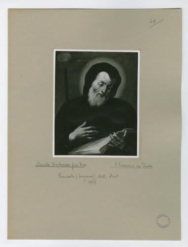- NOTIZIE STORICO CRITICHE La fotografia, che riproduce il San Francesco da Paola di Scuola lombarda della fine del Seicento, fa parte dell'insieme archivistico denominato "Collezione Züst" (due cartelle: C. XI e C. XII), nello specifico, è conservata all'interno della cartella C. XI. Trattasi del frutto dello studio condotto da Antonio Morassi sulla collezione di Giovanni Züst nel 1957. La fotografia è montata su cartoncino.