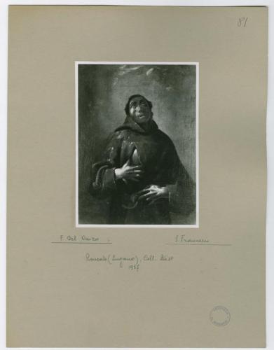 - NOTIZIE STORICO CRITICHE La fotografia riproduce il dipinto raffigurante San Francesco in estasi, già attribuito ad Alessandro Magnasco (1667-1749) da Benno Geiger nel 1949, quando già si trovava nella collezione di Giovanni Züst, riconosciuto come replica di una tela di analogo soggetto del Morazzone (1573-1626) da Enrica Zuppinger e avvicinato alle opere di Francesco Cairo da Virgilio Gilardoni: ipotesi accettata da Antonio Morassi, mentre è passato in asta da Christie's (Londra, 17 febbraio 1978) come opera di Domenico Fetti (Valle Parri 2019, pp. 66, 104). La fotografia fa parte dell'insieme archivistico denominato "Collezione Züst" (due cartelle: C. XI e C. XII), nello specifico, è conservata all'interno della cartella C. XII. Trattasi del frutto dello studio condotto da Antonio Morassi sulla collezione di Giovanni Züst nel 1957. La fotografia è montata su cartoncino.