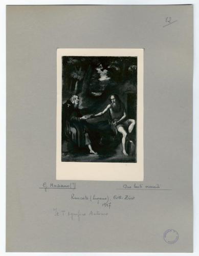 - NOTIZIE STORICO CRITICHE La fotografia riproduce il dipinto raffigurante Sant'Antonio abate e san Paolo, ritenuto fino al 1954 di Pier Francesco Mola, ma schedato dubitativamente da Antonio Morassi come opera di Girolamo Muziano (1532-1592). La fotografia fa parte dell'insieme archivistico denominato "Collezione Züst" (due cartelle: C. XI e C. XII), nello specifico, è conservata all'interno della cartella C. XII. Trattasi del frutto dello studio condotto da Antonio Morassi sulla collezione di Giovanni Züst nel 1957. La fotografia è montata su cartoncino.
