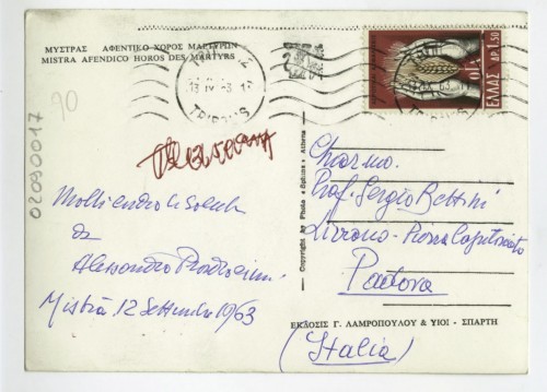 - ISCRIZIONI supporto primario: verso: in alto a sinistra - Mistra. Afendico Horas des Martyrs - a matita -