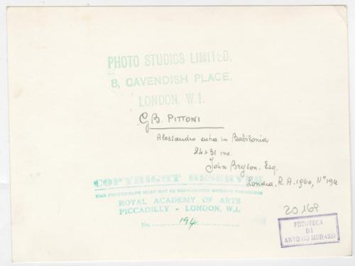 - ISCRIZIONI supporto primario: verso: al centro - [sottolineato:] G.B. Pittoni/ Alessandro entra in Babilonia/ 24 x 31 inc./ John Bryson, Esq./ Londra, R.A. 1960, N° 194 - a matita -