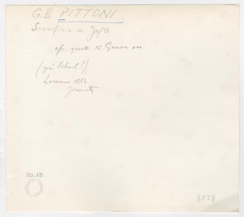 - ISCRIZIONI supporto primario: verso: in alto - G.B. [sottolineato:] PITTONI/ Sacrificio di Jefte/ cfr. quelli di Genova ecc./ (già Schub.?)/ Losanna 1963/ Jeamat. - a matita -