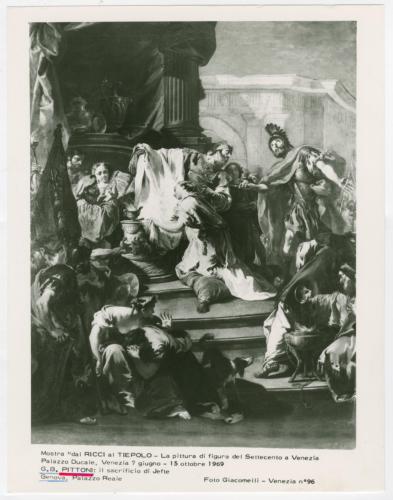 - ISCRIZIONI supporto primario: recto: in basso - Mostra "dal RICCI al TIEPOLO - La pittura di figura del Settecento a Venezia/ Palazzo Ducale, Venezia 7 giugno - 15 ottobre 1969/ G.B. PITTONI: Il sacrificio di Jefte/ Genova, Palazzo Reale - Foto Giacomelli-Venezia n° 96 - a matita -