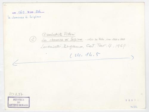 - ISCRIZIONI supporto primario: verso: al centro - [cerchiato:] 2 [sottolineato:] Giambattista Pittoni/ La clemenza di Scipione - olio su tela, cm 134 x 160/ Lorenzelli, Bergamo, cat. Tav. 4, 1969 - a matita -