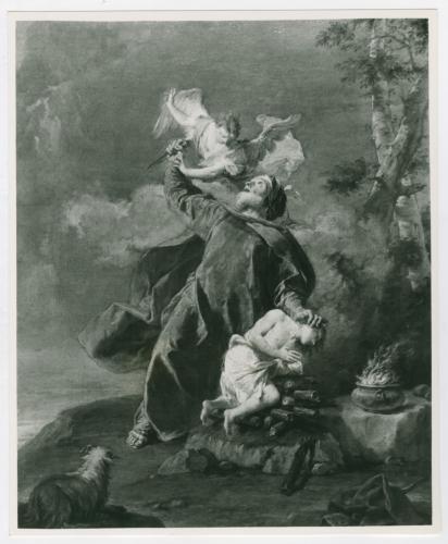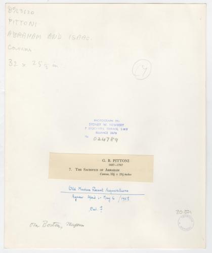 sul verso del supporto primario è incollata etichetta con iscrizione a stampa: "G.B. PITTONI/ 1687-1767/ 7. THE SACRIFICE OF ABRAHAM/ canvas, 32 1/2 x 25 1/2 inches".