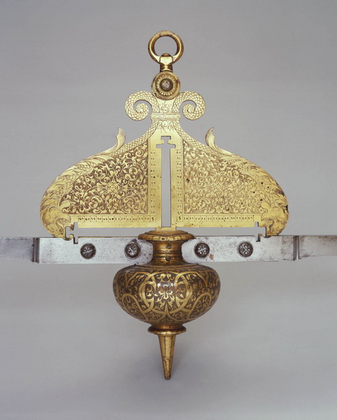 Perpendicolo costituito da due lunghe aste di acciaio, complete di traguardi sagomati alle estremità. Le aste in prossimità del corpo dello strumento si biforcano ricoprendo la base dello strumento stesso, alla quale sono avvitate e della quale seguono il disegno. Le viti passanti sono costituite da una testa tozza e munita di quattro rilievi (una danneggiata) e si incastrano all'interno di una rondella romboidale sagomata a fogliami che attualmente sembra fissata all'asta. Lo strumento di ottone è diviso in due parti. La parte superiore è costituita dalla base di ottone situata all'interno delle suddette aste e innestata al centro nella parte inferiore. La parte superiore presenta tre fessure, una al centro e due in corrispondenza della base, divise, su una sola faccia, 65-5, 5-65; entro le fessure erano posizionati altrettante viti senza fine lungo le quali scorreva un cursore (viti senza fine e cursori mancanti). Le superfici della parte superiore sono decorate su entrambe le facce con fitte quadrettature in chiaroscuro e rilievi a fogliami. Ai bordi sono raffigurati due mostri marini la cui coda forma il ricciolo nel quale termina lo strumento. I due riccioli terminali sono uniti da una incisione a forma di fascia, sopra e sotto la quale sono raffigurati diversi tipi di frutta e verdura (pere, rape e melograni). Tra i due riccioli è sistemato un doppio disco attraversato da un perno sopra al quale si trova l'anello di sospensione. La parte inferiore è costituita da un peso piriforme con base a punta e collo sottile al quale aderiscono le due aste d'acciaio, ed è attraversato da due perni che fissano la parte superiore. Anche questa parte inferiore è riccamente decorata con volute e fogliame.