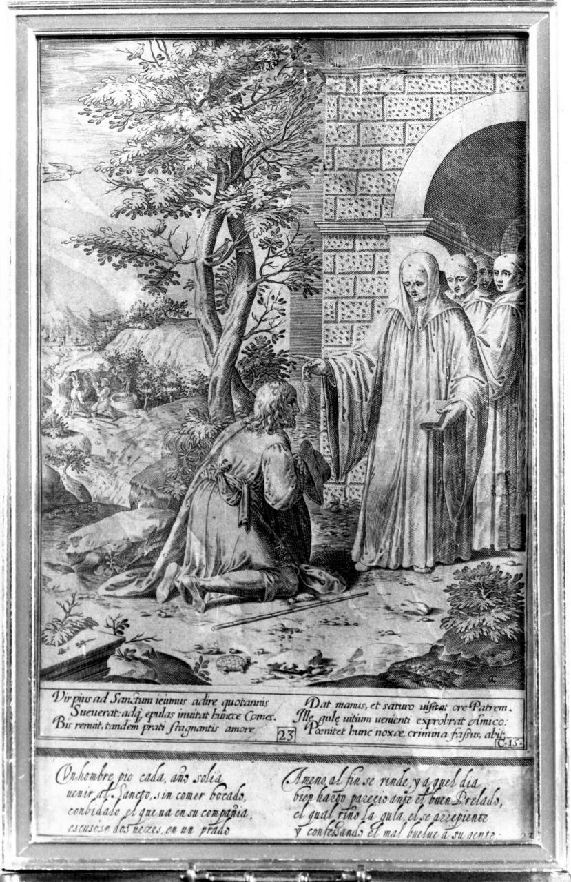 San Benedetto che redarguisce un pellegrino che ha peccato di gola, San Benedetto rimprovera un pellegrino (stampa) di Caprioli Aliprando, Passeri Bernardino (sec. XVI)