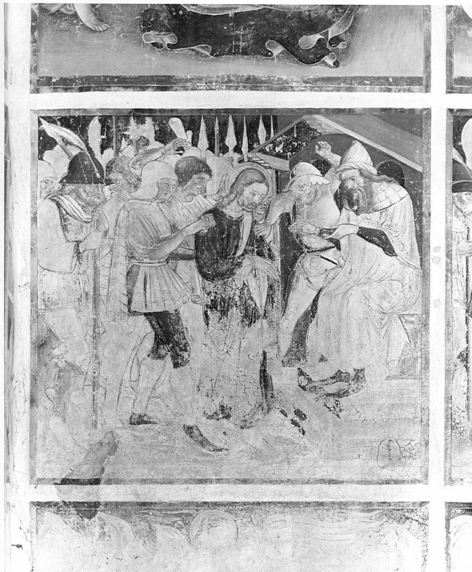Cristo davanti a Caifa (dipinto, elemento d'insieme) di Borlone Jacopo (attribuito), Busca Giacomo (attribuito) (sec. XV)