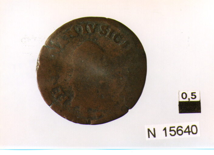 R/ busto a testa nuda a destra con lunghi capelli sciolti; V/ torre (moneta, nove cavalli) (sec. XVIII d.C)
