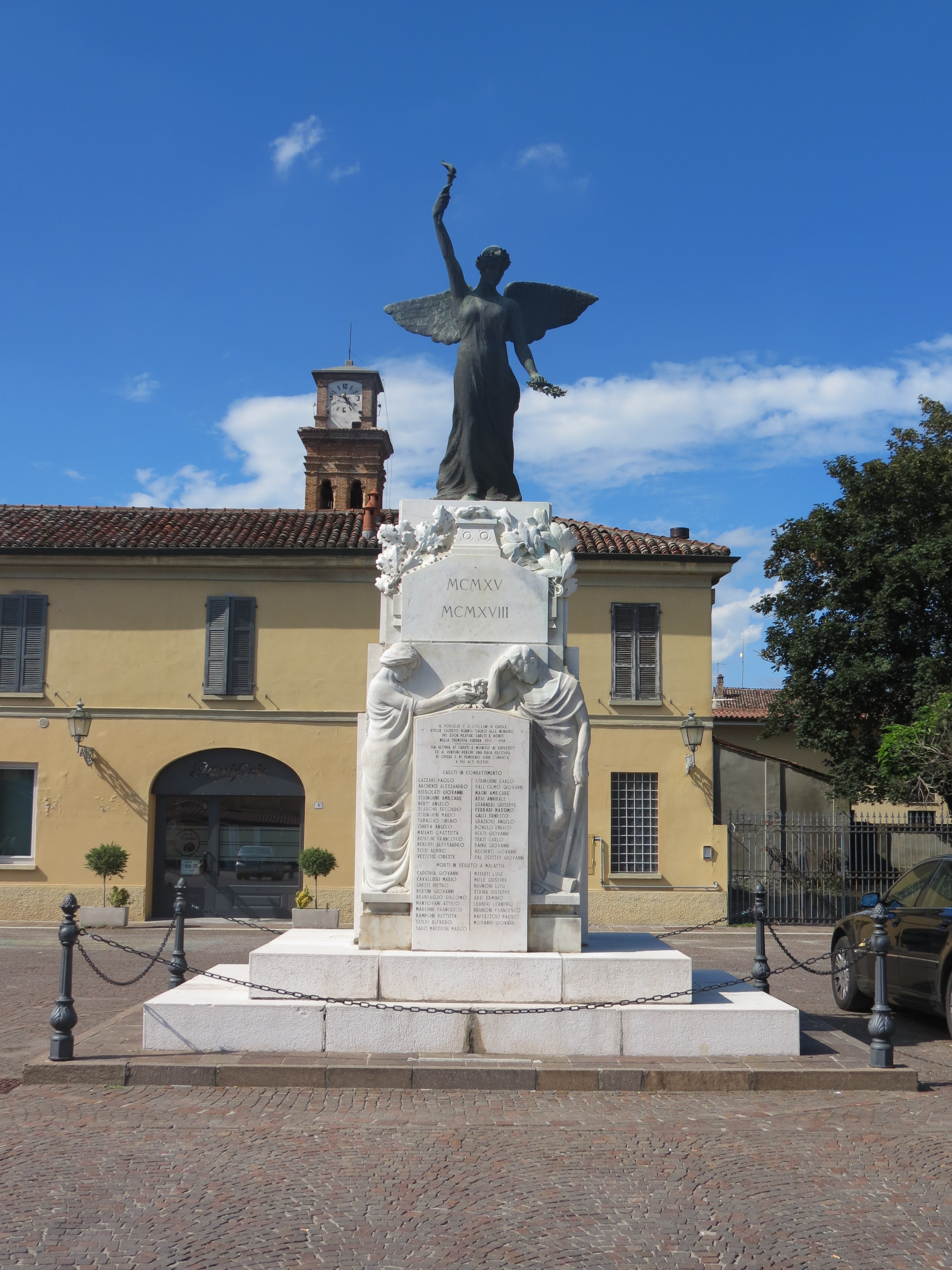 allegoria della Vittoria come donna vestita all'antica con una fiaccola e una corona di alloro (statua in bronzo), figura femminile con foglie di alloro e figura maschile con una mazza (rilievo sul lato frontale del cippo) (monumento ai caduti - a cippo) di Balestreri Aldo (sec. XX, sec. XX)
